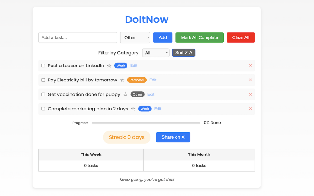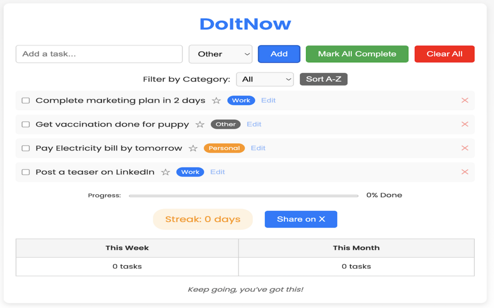 Categorize tasks, filter by category, sort alphabetically, mark tasks as important, track progress, maintain streaks, share on X, motivational quotes