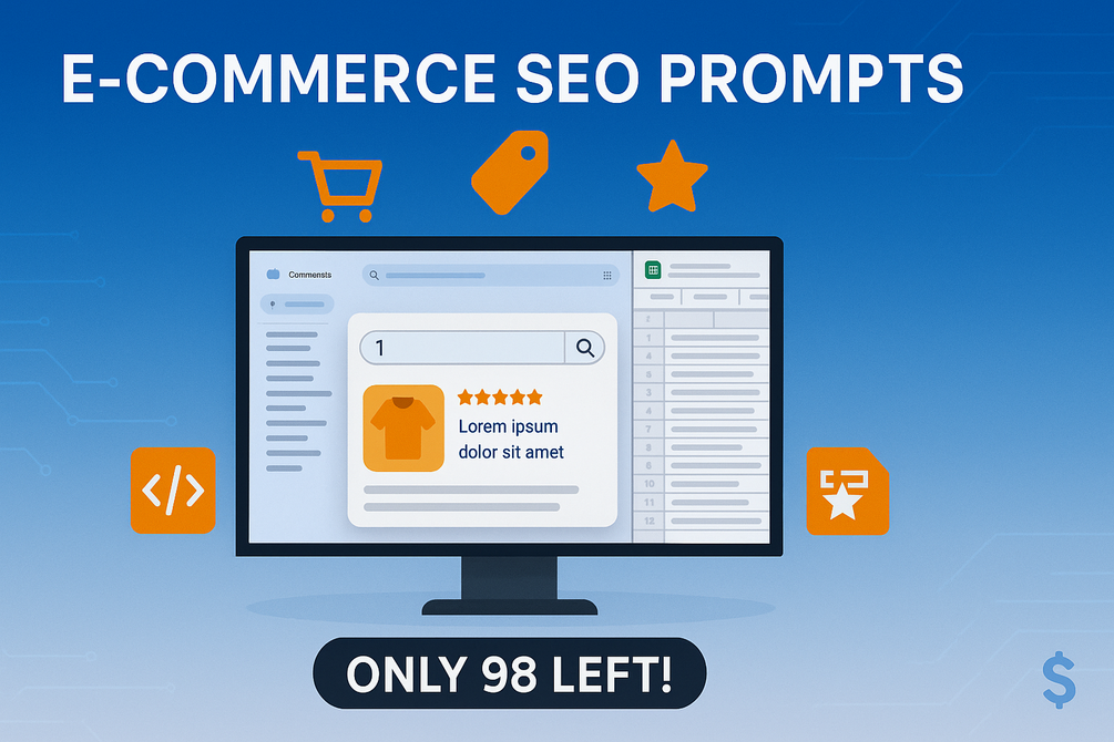 Supercharge your e-commerce rankings with 100-Plus E-Commerce SEO Prompts - a Google Sheets spreadsheet packed with 100 pro-level prompts to master SEO for online stores.
