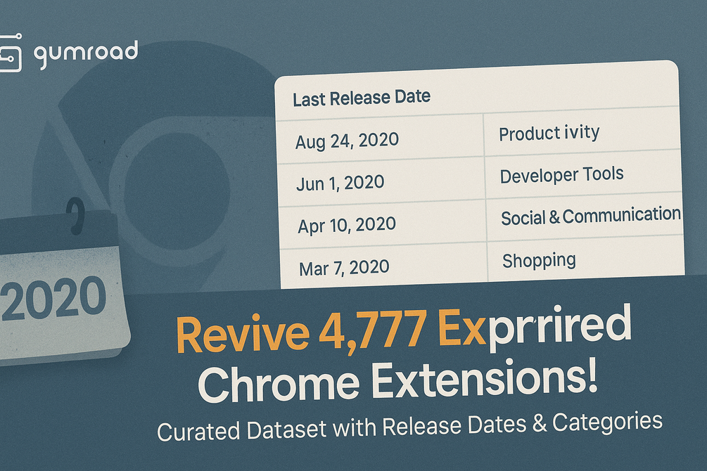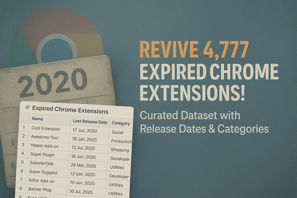 A curated dataset of 4,777 expired Chrome extensions—abandoned apps with 500+ users and 3.5+ star ratings (10+ votes). Includes `release_date` and `created_date` to uncover long-forgotten treasures and `category_slug` for niches like `productivity/developer` and `make_chrome_yours/privacy`. Delivered as a CSV, with JSON and a revival guide (PDF) as bonuses, plus a free sample of 100 extensions.